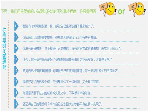 培訓從一場有趣的時間管理測試展開,通過有趣的問答讓大家快速進入情境,加深對培訓必要性的認知。時間和才華是我們一生擁有的兩大財富,但若是隨著時間的流逝,我們的才華并沒有增加,這就是虛度了時光。只有我們妥善安排并利用好時間,通過實現(xiàn)人生旅途中一個個小目標,才能最終實現(xiàn)自己的人生大目標,實現(xiàn)規(guī)劃中的理想生活。